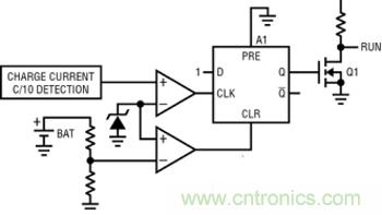 前述電路的方框圖如圖 1 所示。該電路基于一個 D 觸發(fā)器。隨著充電電流值降至預設定的 C/10,D 觸發(fā)器時鐘變?yōu)楦唠娖?,外部晶體管 Q1 將 RUN 引腳拉至地,并關斷 LTC4012。電池充電,電壓接近最大值。隨著充電器關斷,電池開始放電,最終達到最小電壓,D 觸發(fā)器清零,然后 Q1 關斷,充電周期重復。