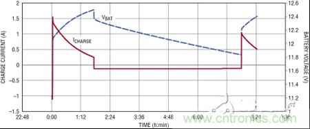 為了驗證電路功能,將一個數(shù)據(jù)記錄器連至充電器-電池系統(tǒng)。對電池電壓和電流進行采樣和存儲。為了方便電池的自放電并縮短放電時間,在電池端子之間連接一個 100Ω 電阻器。所產生的圖形如圖 3 所示。在周期一開始時,輸入電壓 VIN 被斷開,電池放電,并向負載提供“負”電流。然后,加上 VIN 后,充電周期啟動,“正”的充電電流流進電池。當電池充滿電以后,充電器關斷,電池開始自放電。當電池電壓達到最小值時,充電器接通,周期自我重復。