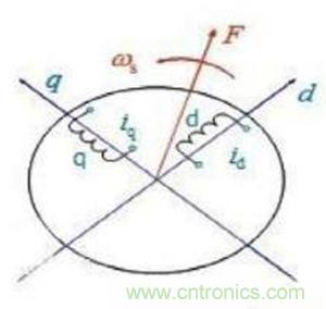 由此可見,以產(chǎn)生同樣的旋轉(zhuǎn)磁動勢為準則,圖1的三相交流繞組、圖2的兩相交流繞組和圖3中整體旋轉(zhuǎn)的直流繞組彼此等效?;蛘哒f,在三相坐標系下的iA、iB 、iC,在兩相坐標系下的ia、ib和在旋轉(zhuǎn)兩相坐標系下的直流id、iq是等效的,它們能產(chǎn)生相同的旋轉(zhuǎn)磁動勢。