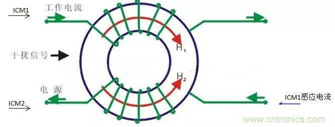 當(dāng)電路中的正常電流通過時,電流在同相位繞制的電感線圈中產(chǎn)生反向的磁場而相互抵消,此時正常信號電流主要受線圈電阻的影響(和少量因漏感造成的阻尼);當(dāng)共模電流流過線圈時,由于共模電流的同向性,會在線圈類產(chǎn)生同向的磁場而增大線圈的阻抗,使線圈表現(xiàn)為高阻抗,產(chǎn)生較強(qiáng)的阻尼效果,以此衰減共模電流達(dá)到濾波的目的。