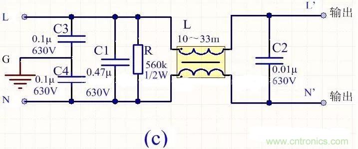 為降低成本和減小體積,開關(guān)電源一般采用簡易的EMI濾波器,主要包括共模扼流圈L和濾波電容,以下四種可以根據(jù)情況進(jìn)行選擇:
