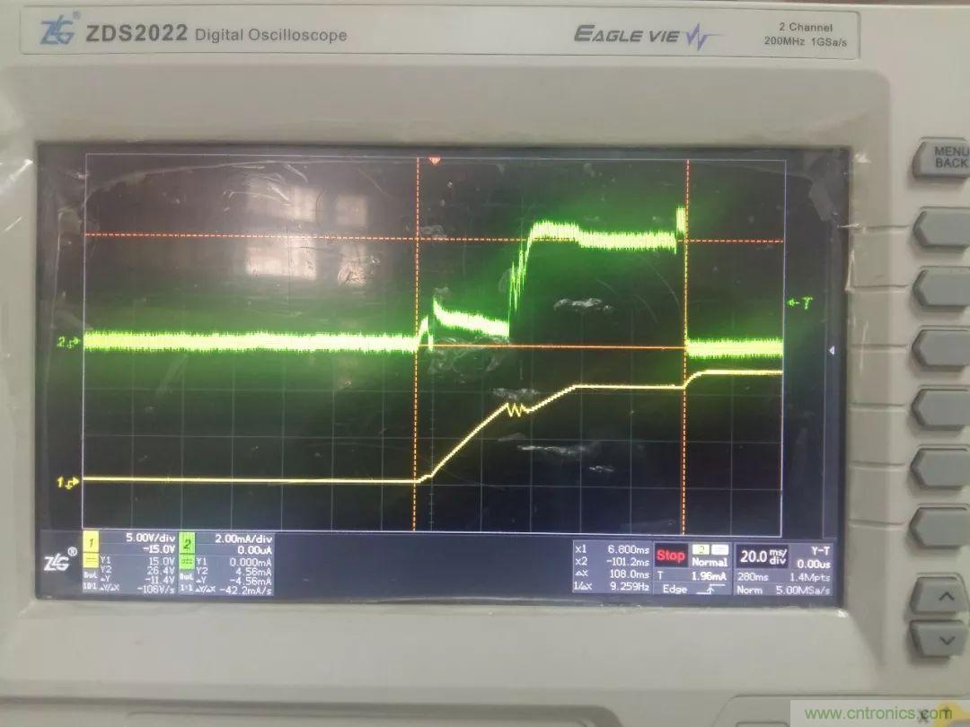 如下圖3所示,為圖2電路的實驗波形圖,綠色為IE電流波形,黃色為VDD電壓波形(示波器采用zlgZDS2022)。從圖中可看出開關(guān)電源啟動可分三個階段,第一階段,在上電時IE以近似1mA的電流向電容C充電,當(dāng)VDD電壓達到UCC28C40門限電壓時進入第二階段,此時飽和電流增加至5mA,在為IC供電的同時繼續(xù)為電容充電,當(dāng)輸出電壓建立后進入第三階段,此時IE電流為零,啟動電路停止工作,VDD電壓上升至輔助繞組電壓。在啟動的整個過程中,IE的電流都是比較小而且比較平緩,所以該電路安全可靠。