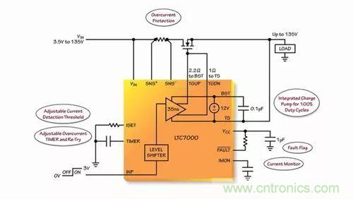由此可見,作為一款靈活和堅固的器件,可使汽車和工業(yè)制造商提高其系統(tǒng)的性能和可靠性。LTC7000 所具備的高達 135V 的電壓范圍、內(nèi)置的保護功能、強大的驅(qū)動器、快速接通和關(guān)斷時間能力,使得制造商能夠開發(fā)出為客戶增添附加值和可靠性的系統(tǒng)。因而它主要運用于靜態(tài)開關(guān)驅(qū)動器、負載和電源開關(guān)驅(qū)動器、電子閥驅(qū)動器以及高頻高壓柵極驅(qū)動器。