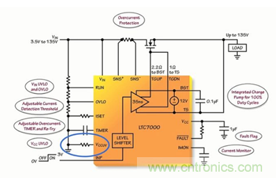 因為LTC7000 還具有一個 TIMER 引腳,因此過流情況不會立刻關(guān)斷外部 MOSFET。在 TIMER 引腳和地之間連接一個電容器,它用于設(shè)定在外部 MOSFET 在過流故障情況下被關(guān)斷之前的延遲周期,該關(guān)斷延遲周期可設(shè)定在最短 1.4µs (如果 TIMER 引腳開路) 到幾十或幾百 ms (如果電容器為µF 級) 的范圍內(nèi),布設(shè)在 TIMER 引腳上的同一個電容器還負責設(shè)定一個冷卻周期。