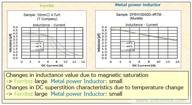 同時,針對溫度的變化,金屬合金粉材質(zhì)的電感衰減比鐵氧體要緩慢很多。