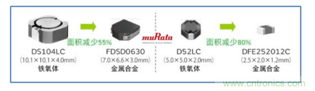同等特性時(感值、飽和電流等),金屬合金功率電感比鐵氧體功率電感的外形尺寸小50%左右,可以實現(xiàn)小型化和薄型化。