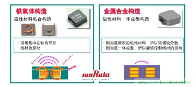 對于金屬合金構(gòu)造的電感來說,因為形成線圈的磁性材料是微粒的,所以磁場較分散;一體成型構(gòu)造也能夠控制線材的振動,從而很難產(chǎn)生嘯叫問題。
