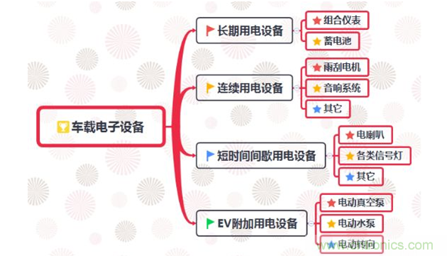 作為電動汽車的供電設(shè)備,DC/DC變換器也給車載電子設(shè)備供電。根據(jù)純電動汽車車載電子設(shè)備不同屬性,可把用電設(shè)備分為長期用電設(shè)備、連續(xù)用電設(shè)備、短時間間歇用電設(shè)備和EV附加用電設(shè)備等四種類型,如下圖所示。同時,DC/DC變換器的體積和種類都很小且輸出穩(wěn)定。