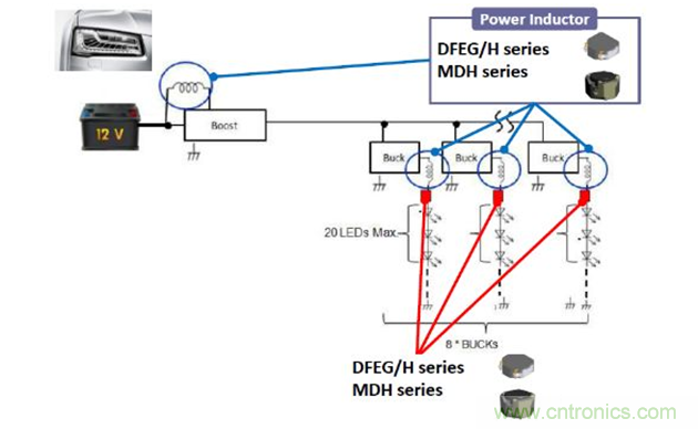 在汽車應(yīng)用中,目前車燈廣泛采用LED光源,因此會用到Boost DC/DC和Buck DC/DC等轉(zhuǎn)換器。