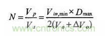 變壓器的變比與變換器的傳輸功率、主電路拓撲結(jié)構(gòu)以及占空比相關(guān)。越大,變壓器原邊的電流越小,原邊總的損耗越小,同時副邊整流管要承受的電壓應(yīng)力也越小,變壓器的效率越高。同時,應(yīng)能滿足在所有輸入電壓范圍內(nèi)都能得所需要的輸出電壓,因此,在計算變壓器變比的時候應(yīng)考慮在最小輸入電壓情況下輸出滿載且占空比最大進行。