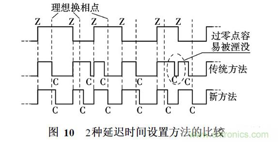采用傳統(tǒng)的延遲時間設(shè)置方法,某些換相點偏離理想換相點較大. 當某次換相嚴重滯后時,下次過零點容易被湮沒,導致電機失步,如圖10所示.