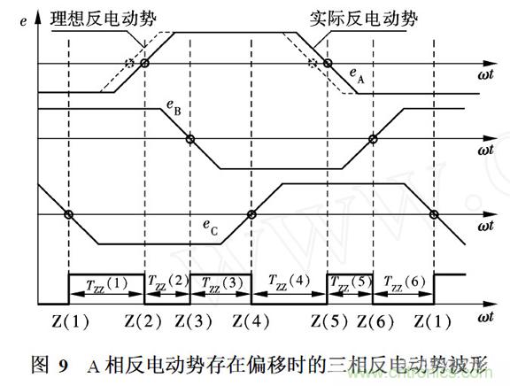 假設(shè)A 相反電動勢存在相位偏移, 波形上升和下降部分上的過零點滯后出現(xiàn),導致過零點在時間軸上分布不均勻. 如圖9所示, 虛線表示理想反電動勢,實線表示存在相位偏移的實際反電動勢,過零點的間隔時間TZZ (1) , TZZ ( 2)和TZZ ( 3)不相等. 每相反電動勢波形上升和下降部分的2個過零點相差180°電角度, 過零點間隔時間存在著周期性規(guī)律,如TZZ ( 1) =TZZ ( 4) , TZZ ( 2) = TZZ ( 5)和TZZ (3) = TZZ (6) .