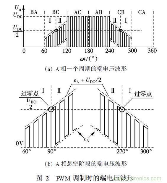 分析了上橋臂PWM 調(diào)制、下橋臂恒通調(diào)制方式時的端電壓波形,討論相應的反電動勢過零點檢測方法. 在PWM 調(diào)制信號開通狀態(tài)結(jié)束時刻對端電壓進行采樣,由軟件算法確定反電動勢過零點. 針對電機運行時存在超前換相或滯后換相的情況,通過設(shè)置合理的延遲時間來實現(xiàn)最佳換相. 針對實際電機存在反電動勢過零點分布不均勻的情況,根據(jù)過零點間隔時間存在著周期性規(guī)律,提出一種新的延遲時間設(shè)置方法,使換相點位于相鄰過零點的中間位置,實現(xiàn)了電機的準確換相. 實驗驗證了所提出方法的可行性和有效性.