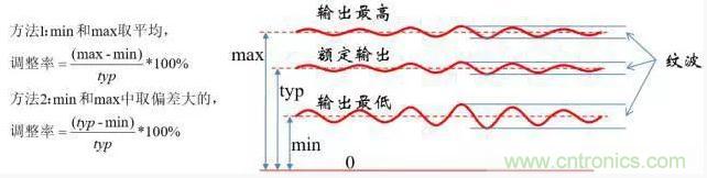 ■注意區(qū)分調(diào)整率和紋波,紋波是輸出的動(dòng)態(tài)特征,而調(diào)整率是讓電源 工作在極限外部條件下,輸出的極限偏差。
