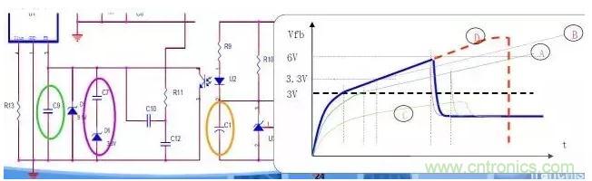 IC的OCP功能是檢測Vfb達(dá)到Vsd(如6V)實(shí)現(xiàn)的。所以要降低Vfb斜率,就可以延長Vfb的上升時(shí)間。