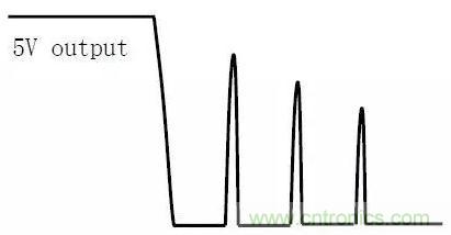 在輸出空載或輕載時(shí),關(guān)閉輸入電壓,輸出(如5V)可能會出現(xiàn)如下圖所示的電壓反跳的波形。