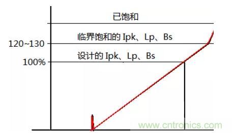 優(yōu)化方向是Bs值最優(yōu)化,約束條件是磁芯品質,可按 Bs(或原邊電感量 Lp)擴大20%~30%余量后 Ipk 波形可見臨界飽和跡象為判據(jù)確定Bs取值。更高的Bs取值,對應更小的氣隙、更小的漏感,更小的尖峰電壓、可能更高的整機效率。但太高的Bs取值會使上述余量更小、磁芯的品質控制困難、成品率降低。