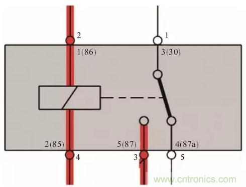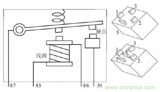 如下圖所示,85#和86#端子是線圈,屬于控制部分;87#和30#端子是觸點,屬于被控制部分(即輸出端)。