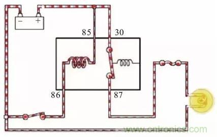 車輛繼電器多為四腳,工作原理如下圖所示。當開關(guān)閉合后電流從蓄電池正極經(jīng)過繼電器的85#線圈端子從86#流回蓄電池的負極,線圈兩端就會產(chǎn)生磁場。線圈產(chǎn)生磁場后,就會吸引觸點的87#和30#端子,使繼電器的觸點閉合,從而實現(xiàn)小電流控制大電流。