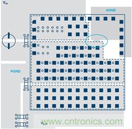 圖2:分開的AGND和PGND在接地標(biāo)簽下方利用過孔連接。