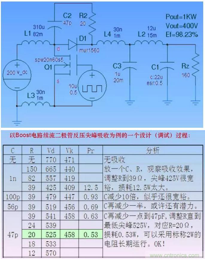 對應(yīng)一個特定的吸收環(huán)境和一個特定大小的電容C,有一個最合適大小的電阻R,形成最大的阻尼、獲得最低的電壓尖峰。