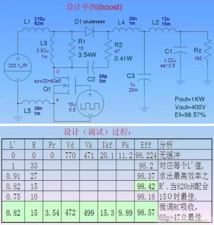 RC吸收的設(shè)計方法的難點在于:吸收與太多因素有關(guān),比如漏感、繞組結(jié)構(gòu)、分布電感電容、器件等效電感電容、電流、電壓、功率等級、di/dt、dv/dt、頻率、二極管反向恢復(fù)特性等等。而且其中某些因素是很難獲得準確的設(shè)計參數(shù)的。