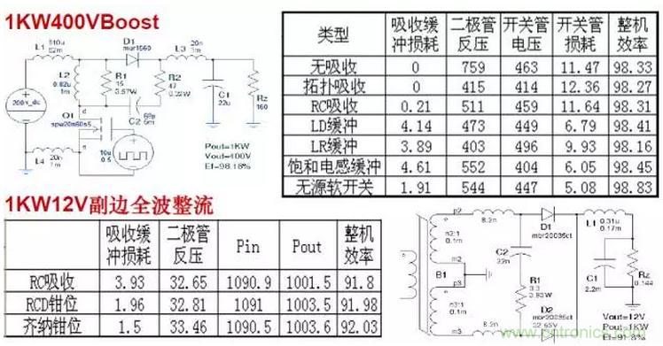 無源無損軟開關(guān)電路效率明顯高于其他緩沖吸收方式,與有源軟開關(guān)電路效率相差無幾。因此只要能夠?qū)崿F(xiàn)無源軟開關(guān)的電路,可不必采用有源軟開關(guān)。