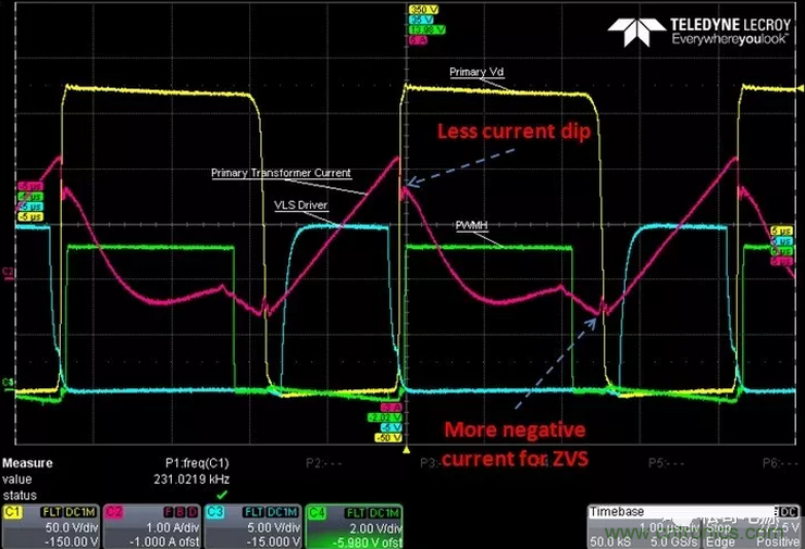 (2)、GaN的Coss 及Qoss非常小,要求實現(xiàn)ZVS開通所需要的激磁電流小,這樣就減小系統(tǒng)的環(huán)流,從而降低在功率MOSFET和變壓器中產(chǎn)生的導通損耗,同時也可以減小變壓器磁芯的損耗。