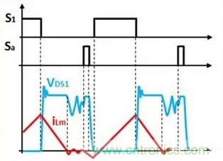 在主開關(guān)管開通前,先開通輔助繞組的開關(guān)管,輔助電源對輔助繞組進行電流反灌,將能量儲存在變壓器中;輔助繞組的開關(guān)管關(guān)斷后,變壓器儲存的能量抽取主開關(guān)管COSS的能量,COSS放電電壓降低,直到其內(nèi)部體二極管導通,這時候開通主開關(guān)管,就能實現(xiàn)零電壓開通ZVS。