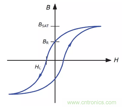 一般高頻電感所用的鐵氧體鐵芯是含有鎳鋅或錳鋅之鐵氧體化合物,屬于矯頑磁力低的軟磁類(lèi)鐵磁材料。圖1為一般磁鐵芯之磁滯曲線,磁性材料的矯頑磁力HC亦稱(chēng)為保磁力,系指當(dāng)磁性材料已磁化到磁飽和后,使其磁化強(qiáng)度減為零時(shí)所需的磁場(chǎng)強(qiáng)度。矯頑力較低代表抵抗退磁能力較低,也意味著磁滯損失較小。
