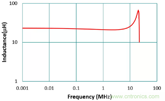 電感器之電感值在電路設(shè)計(jì)時(shí)為最重要的基本參數(shù),但必須看在工作頻率下此電感值是否穩(wěn)定。電感的標(biāo)稱(chēng)值通常是在沒(méi)有外加直流偏置的條件下,以100 kHz 或1 MHz 所量得。且為確保大量自動(dòng)化生產(chǎn)的可能性,電感之容差值(tolerance)通常是 ±20%(M)與±30%(N)居多。圖3為利用表量測(cè) 電感220M 之電感-頻率特性圖,如圖所示,在5 MHz 之前電感值的曲線較為平坦,電感值幾乎可視為常數(shù)。在高頻段因寄生電容與電感所產(chǎn)生的諧振,電感值會(huì)上升,此諧振頻率稱(chēng)為自我諧振頻率,通常需遠(yuǎn)高于工作頻率。