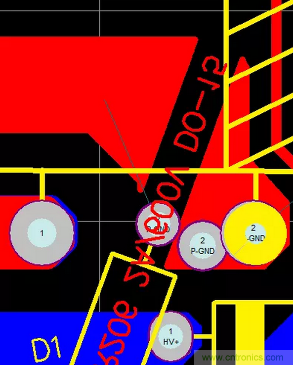 47.PCB的熱點(diǎn)區(qū)域一定要遠(yuǎn)離輸入、輸出端子,防止噪聲源串到線(xiàn)上導(dǎo)致EMI變差,在不得已而為之時(shí),可增加地線(xiàn)或其它屏蔽方式進(jìn)行隔離,如下圖增加了一條地線(xiàn)進(jìn)行有效隔離。
