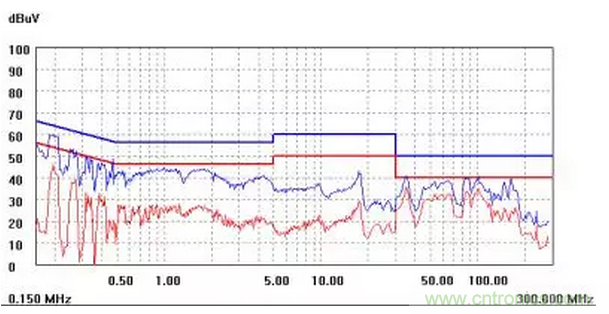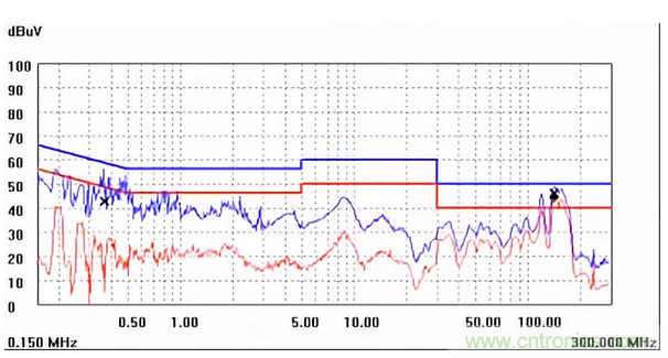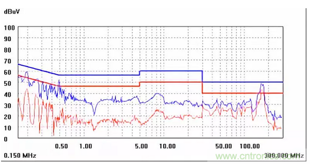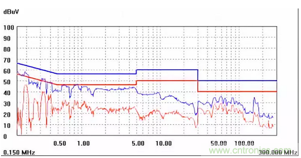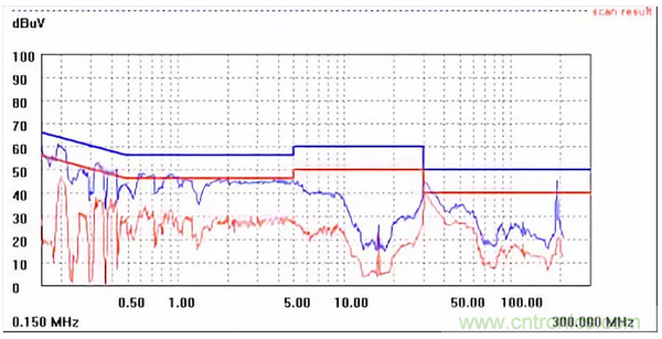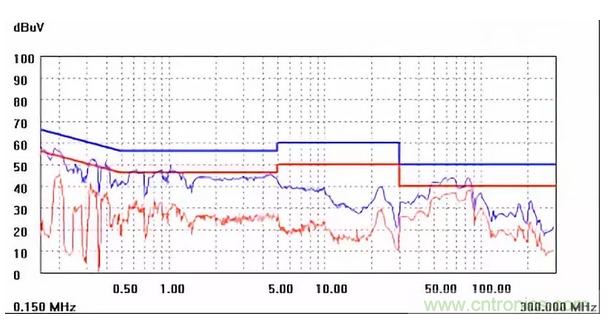 圖一a可以看出,改變PCB布局后130M-200M已經(jīng)完全被衰減,但是30-130M沒(méi)有圖一效果好,可能變壓器出線(xiàn)無(wú)交叉好一些。仔細(xì)觀察,此IC具有抖頻功能,傳導(dǎo)部分頻段削掉了一些尖峰;