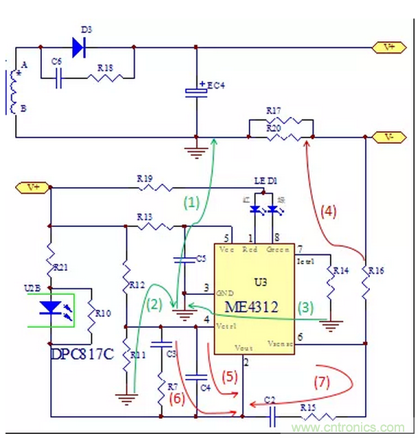 如(1)(2)(3)綠線(xiàn)所示,R11的地和R14的地連接到芯片的地,再連接到EC4電解電容的地。注意不可連到變壓器的地,因?yàn)樽儔浩鞔渭?jí)A->D3->EC4->次級(jí)B形成功率環(huán),如果ME4312芯片的地接到次級(jí)B線(xiàn)到EC4電容之間,受到較強(qiáng)的di/dt干擾會(huì)導(dǎo)致系統(tǒng)的不穩(wěn)定等因素。