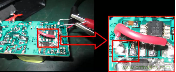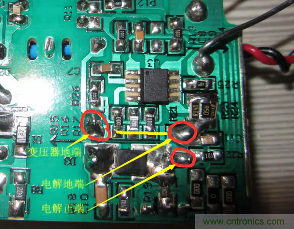 通過(guò)斷開(kāi)PCB銅箔使用一根導(dǎo)線(xiàn)連到輸出電容地,隔開(kāi)ME4312B芯片地,如下圖: