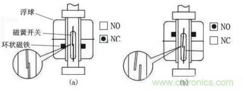 圖(a):當(dāng)水位下降時(shí),環(huán)狀磁鐵下降,磁簧開關(guān)處于接通狀態(tài);