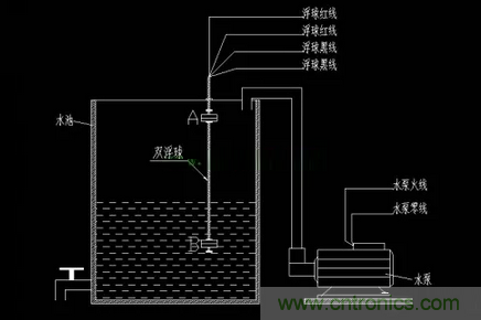 2、當(dāng)水位漲到A、B處限位開關(guān)之間時(shí),B處開關(guān)斷開,A處開關(guān)仍然是閉合狀態(tài),此時(shí)線圈被自鎖得電,水泵繼續(xù)運(yùn)行;
