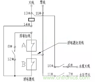 上圖中,6#與10#、7#與11#、8#與12#是繼電器常開觸點(diǎn),13#與14#繼電器線圈觸點(diǎn),A和B分別是雙浮球的上下限位開關(guān)。該電路只有當(dāng)水位下降至最低限位之后才會(huì)工作。