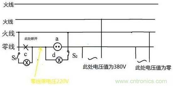 給出草圖當(dāng)零線斷開時,如過上端負(fù)載有未斷開的情況,如圖S2閉合的情況火線與零線通過負(fù)載的線圈串聯(lián)到了一起,那么零線就是和火線帶一樣的電壓值。你家里的零線如果是從斷點(diǎn)后端接出來的,電壓值如上圖兩種情況380V或者零伏。