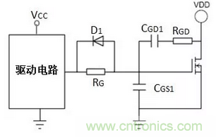 功率MOSFET的跨導大,開通過程中,VGS較小的變化都會導致ID急劇的變化,進而導致VDS急劇的變化,瞬態(tài)過程中柵極電壓容易產(chǎn)生振蕩。串聯(lián)電阻RGD可以抑制回路的瞬態(tài)高頻電流,形成阻尼振蕩從而抑止柵極的高頻振蕩,減小振蕩的幅度。