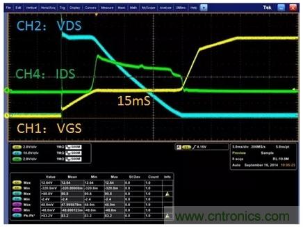 根據(jù)系統(tǒng)浪涌電流和di/dt的要求,使用上面公式就可以求出外加的電容CGS1,由此選取相應的標準電容值。不同的CGS1值可以改變過沖的峰值浪涌電流的大小。
