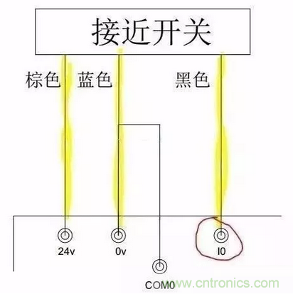 如圖三所示,這是PLC 的實際接線,黃色熒光筆標(biāo)識的是接近開關(guān)的三根接線,棕色和藍色分別接到PLC 的24V和0V上,黑色接到I0上。當(dāng)有物體到達接近開關(guān)的感應(yīng)距離時,PLC的I0便會有輸入,我們在程序里就可以做處理。需要注意的是,圖中0V和COM0短接,因此,這種接法適合PNP型的接近開關(guān)。而NPN型的接近開關(guān)按此接法,是不會有任何信號的。接近開關(guān)的接線只和NPN,PNP類型有關(guān)和感性 容性無任何關(guān)系。
