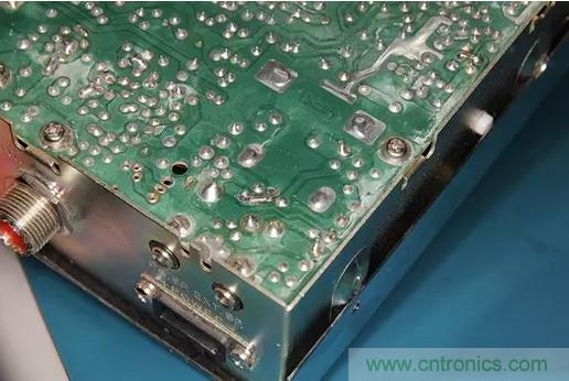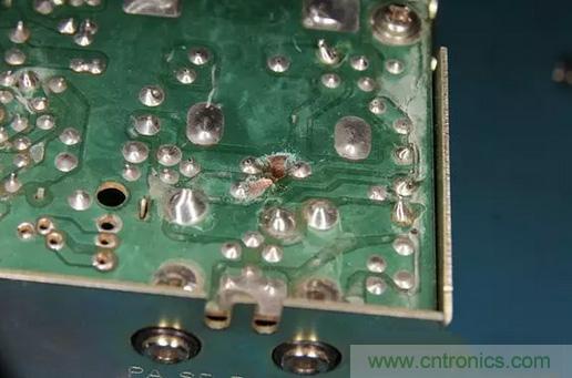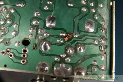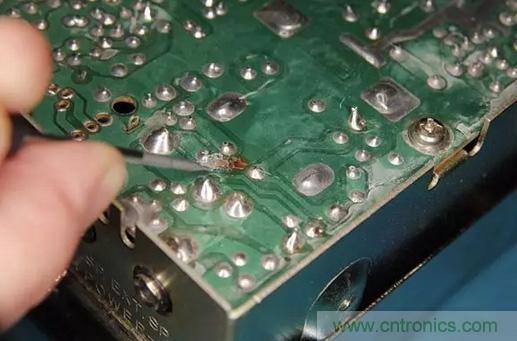 很自然地,保險(xiǎn)絲會(huì)熔斷,但大家又不總是會(huì)用相同額定電流的保險(xiǎn)絲來(lái)替換。通常情況下,他們會(huì)用更高額定電流的保險(xiǎn)絲來(lái)做替換。所以,當(dāng)收音機(jī)仍然反向連接電源,就會(huì)出現(xiàn)保險(xiǎn)絲沒(méi)有熔斷,PCB電路板上走線有燒斷的現(xiàn)象。如下圖所示。
