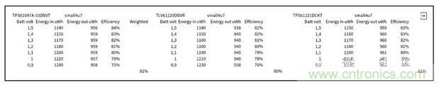 Otii工具讓效率計(jì)算變得非常簡(jiǎn)單,只需將輸出能量除以輸入能量即可,然后根據(jù)案例一測(cè)量設(shè)置中的說(shuō)明對(duì)該效率值進(jìn)行加權(quán)。圖5為所有三個(gè)DC/DC轉(zhuǎn)換器提供了一個(gè)概覽。