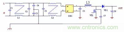 圖中C2 是二極管VD1 和VD2 與散熱器之間的耦合電容,容量一般在幾十PF,C3 是增加的電容,C3 要遠(yuǎn)大于C2,DC/DC 整流管、續(xù)流管上的電壓峰值經(jīng)過C2 與C3 的分壓,幅度大大降低,就可以大大減小向外的輻射。