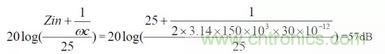 傳導(dǎo)發(fā)射測試設(shè)備內(nèi)部的去耦網(wǎng)絡(luò)(LISN)內(nèi)阻Zin 標(biāo)準(zhǔn)為50Ω。則耦合電容C7 與測試設(shè)備去耦網(wǎng)絡(luò)的內(nèi)阻Zin 對騷擾電平的衰減為: