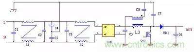 在0.15MHz~1MHz 的頻率范圍內(nèi),騷擾主要以共模的形式存在,在1MHz~10MHz 的頻率范圍內(nèi),騷擾的形式是差模和共模共存,在10MHz 以上,騷擾的形式主要以共膜為主。傳導(dǎo)發(fā)射的差模騷擾的產(chǎn)生主要是由于開關(guān)管工作在開關(guān)狀態(tài),當(dāng)開關(guān)管開通時,流過電源線的電流線形上升,開關(guān)管關(guān)斷時電流突變?yōu)?,因此流過電源線的電流為高頻的三角脈動電流,含有豐富的高頻諧波分量,隨著頻率的升高,該諧波分量的幅度越來越小,因此差模騷擾隨頻率的升高而降低,另外,如下圖1 所示,由于電容C5 的存在,它與電感L3 組成低通濾波器,因此,差模傳導(dǎo)騷擾主要存在低頻率段。