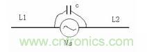 圖中,Vs 為騷擾源,對圖4 來說,就是開關(guān)管VT2 的D 極,L1、L2 相當(dāng)于天線的兩個極,一個極是與開關(guān)管D 極相連的印制線,另外一個極是散熱器及與之相連的接地線,C是天線兩極之間的耦合電容,即圖4 中開關(guān)管與散熱器之間的耦合電容。