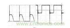 圖7 中,TI 是變壓器,VD1、VD2 分別是整流管和續(xù)流管,由于整流管、續(xù)流管在由導(dǎo)通轉(zhuǎn)向截止時有反向恢復(fù)電流,該反向恢復(fù)電流在VD1、VD2 兩端產(chǎn)生比較高的電壓峰值,由于快恢復(fù)二極管的反向恢復(fù)電流在幾十nS,所以峰值電壓的頻率較高,其基波頻率在幾十MHz,由于頻率很高,輻射能力很強,下圖8 是整流管和續(xù)流管的電壓波形。
