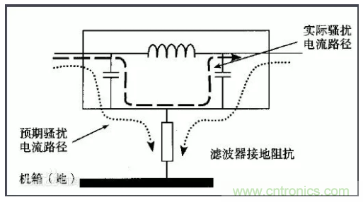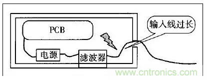 許多設(shè)備的電源線進(jìn)入機(jī)箱后,經(jīng)過很長的導(dǎo)線才接到濾波器的輸入端。例如,電源線從機(jī)箱后面板輸入,走行到前面板的電源開關(guān),又回到后面板接到濾波器?;蛘邽V波器的安裝位置距離電源線入口較遠(yuǎn),造成引線太長(如圖1所示)。